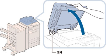 기기의 피더/원고대 커버 위에는 열기/닫기 센서가 장착되어 있습니다(위 그림의 동그라미 친 부분을 참고하십시오). 원고를 원고대 유리에 세트하는 경우, 피더/원고대 커버에서 센서가 분리되도록 피더/원고대 커버를 약 300 mm 들어올리십시오. 센서가 피더/원고대 커버에서 분리되지 않으면 원고 크기가 올바르게 탐지되지 않습니다.