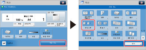 연속 스캔 모드 중에 [설정변경]에 나타나는 설정만 변경할 수 있습니다. 먼저 필요한 복사 설정을 지정해야 합니다. 그러나 연속 작업 모드와 함께 [N on 1]을 지정한 경우 [배율] 또는 [농도]에 대한 설정을 변경할 수 없습니다.