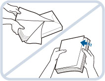 용지를 적재하기 전에 급지가 원활하게 되도록 용지 사이로 여러 차례 바람을 불어넣은 후 가장자리를 정렬하십시오.