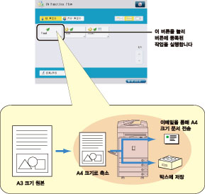예를 들어 박스에 파일의 백업을 저장하는 동시에 A3 원고를 스캔하여 A4 크기로 축소한 다음 이메일을 통해 파일을 송신할 수 있습니다. 이 모든 작업이 플로우 버튼 하나를 누르면 수행됩니다.