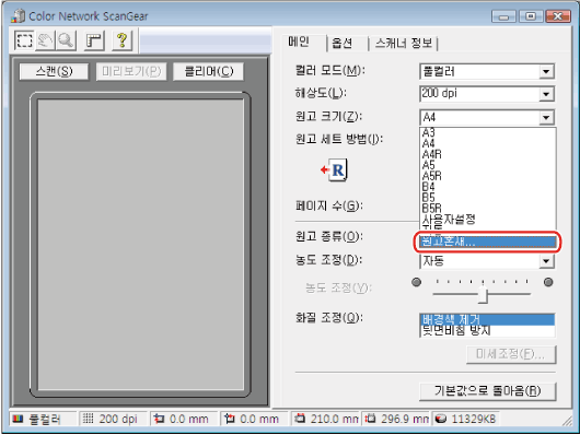사용자 설정 크기 원고를 스캔하려는 경우 [메인] 시트에서 [원고 크기]에 대해 [사용자 정의]를 선택합니다. 또한 이 경우 모든 페이지의 폭은 같아야 합니다.