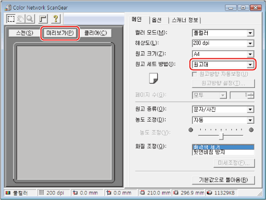 미리보기 영역을 마우스 오른쪽 버튼으로 클릭한 다음 [스캔 영역]을 선택하여 [스캔 영역] 대화 상자를 표시합니다. 스캔할 영역의 크기를 입력하고 [확인]을 클릭합니다. 피더를 사용하여 스캔할 때는 미리보기 영역을 표시할 수 없지만 [스캔 영역] 대화 상자를 사용하여 스캔 영역을 숫자로 지정하거나 빈 미리보기 영역 안에서 마우스를 끌어서 영역을 대략적으로 정의할 수 있습니다.