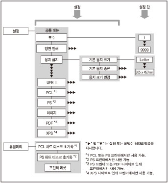 프린터 사양 설정 메뉴를 사용하여 일반 기능에 액세스할 수 있습니다. 다음은 프린터 사양 설정 메뉴 구조에 대한 간략한 개요입니다.