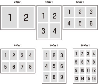 용지 1면에 PDF 파일 데이터의 여러 페이지를 인쇄할 수 있습니다. 여러 페이지가 (위) 왼쪽에서 오른쪽으로 인쇄됩니다.
