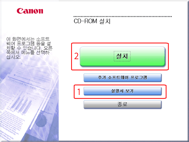 프린터 드라이버 설치 설명서을 보기 위해 먼저 이 버튼을 클릭합니다. 설치를 시작한 후에는 설명서를 볼 수 없습니다.