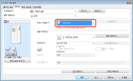 [인쇄 스타일]에 대한 기본 설정은 [양면 인쇄]입니다. 그러나, 일부 드라이버 버전의 경우 [단면 인쇄]가 기본 설정입니다.