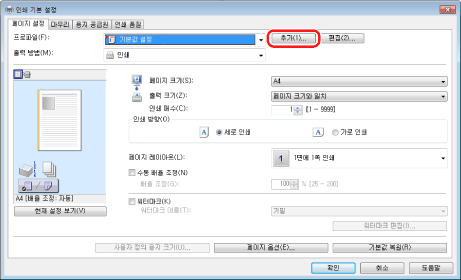 프린터 드라이버 화면에서 프로파일을 편집하거나 삭제하려면 [프로파일]의 오른쪽에 있는 [편집]을 클릭하십시오. 하지만 미리 정의된 프로파일은 수정할 수 없습니다.