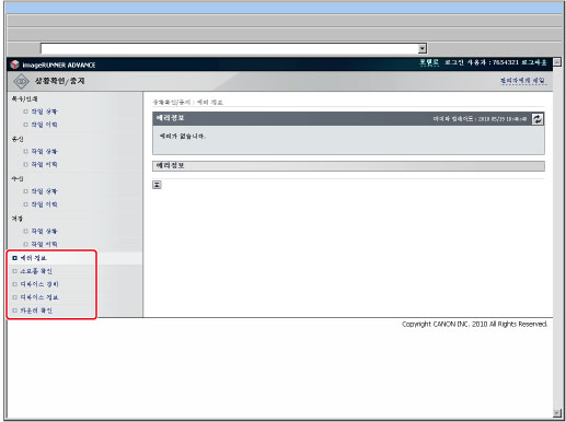 관리자의 정보 및 기기를 설치한 장소 등과 같은 기기와 관련된 정보를 표시합니다.