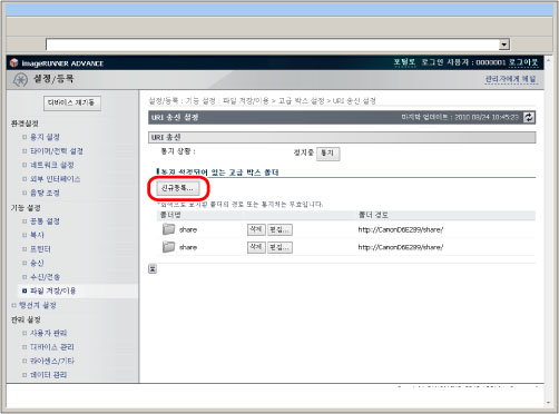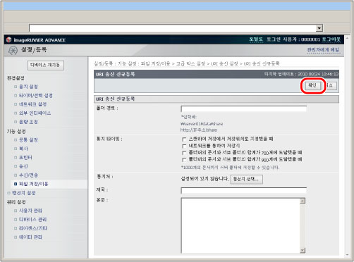 터치 패널 화면의 [스캔하여 저장]에서 고급 스페이스 내 지정한 폴더에 파일이 저장될 때마다 통지가 송신됩니다. 하지만 파일이 하위 폴더에 저장되거나 폴더가 하위 폴더에 추가될 때는 통지가 송신되지 않습니다.