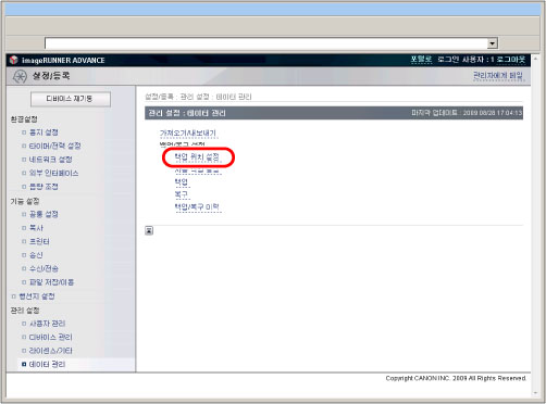 기기의 조작패널에서 [환경 설정]을 눌러 터치 패널에 표시되는 언어를 변경한 후 기기를 재기동하지 않고 저장된 데이터를 백업/복원할 경우 저장된 데이터가 올바르게 백업/복원되지 않을 수도 있습니다.