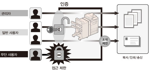 관리자는 인증 모드를 사용하여 일반 사용자의 액세스를 제한하고 작업에 대한 제한을 설정함으로써 사용자를 관리합니다. 일반 사용자 권한은 사용자별로 설정할 수 있습니다. 관리자는 무단 사용자의 액세스를 방지함으로써 기기 변경 및 정보 누출 위험을 줄일 수 있습니다.