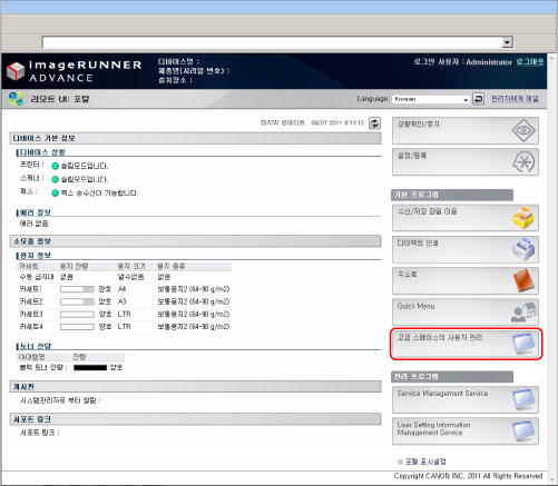 리모트 UI를 사용하려면 [관리설정](설정/등록)에서 [리모트 UI]를 '설정'으로 지정합니다. (See "리모트 UI.")
