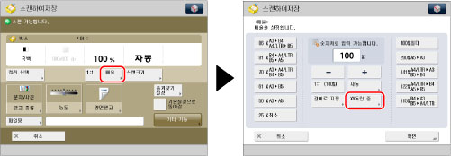 복사 배율의 자동 용지 설정을 사용하여 OHP 필름과 같이 투명도가 높은 원고를 스캔할 수 없습니다. 대신에 정형 배율 모드나 %로 줌 모드를 사용하십시오.