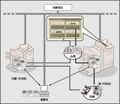 네트워크 장소란 이 기기에서 액세스할 수 있는 네트워크에 있는 다른 imageRUNNER ADVANCE 시리즈 기기의 고습 스페이스를 말합니다.