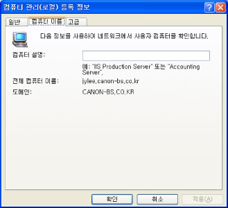 Windows XP의 경우 [내컴퓨터]를 오른쪽 버튼으로 클릭하고 → [관리]를 클릭한 다음 → [컴퓨터 관리(로컬)]를 오른쪽 버튼으로 클릭한 후 → [속성]을 클릭하고 → [컴퓨터 이름] 시트에서 컴퓨터 이름을 확인합니다. Windows Vista의 경우, [