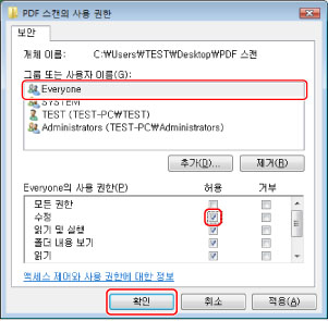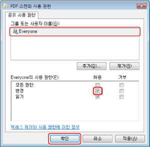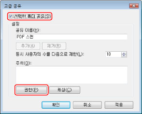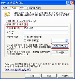 Windows XP에서는 "PDF-스캔" 폴더를 오른쪽 버튼으로 클릭하고 → [속성]을 선택하여 [PDF-스캔 속성] 대화 상자를 표시한 다음 → [공유] 탭을 클릭하고 → [이 폴더 공유]를 선택한 후 → [사용 권한]을 클릭합니다. Windows XP에서는 "PDF-스캔" 폴더를 오른쪽 버튼으로 클릭하고 → [속성]을 선택하여 [PDF-스캔 속성] 대화 상자를 표시한 다음 → [공유] 탭을 클릭하고 → [고급 공유]를 클릭한 후 → [이 폴더 공유]를 선택한 다음 → [사용 권한]을 클릭합니다.