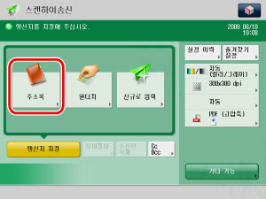 원고대 또는 피더에 원고를 놓고 → 메인 메뉴 화면에서 [스캔하여 송신]을 누릅니다.