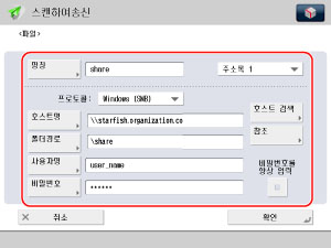 "공유 폴더 생성"(Windows)의 1단계 또는 "공유 폴더 생성"(Mac)의 2단계에서 확인한 컴퓨터 이름을 입력합니다.