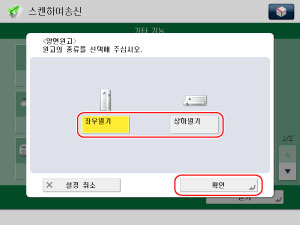 [양면 원고]를 누르고 → 양면 원고의 종류를 지정한 다음 → [확인]을 누릅니다.