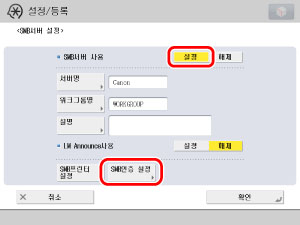 [SMB 인증 설정]을 누르고 → [SMB 인증 사용]을 '설정'으로 지정합니다.