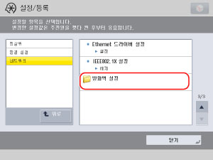 (설정/등록) → [환경 설정] → [네트워크] → [방화벽 설정]을 누릅니다.