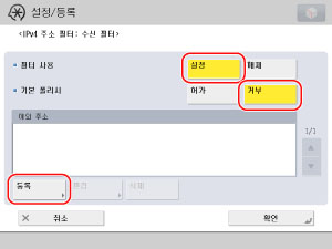 <필터 사용>에 대해 [설정]을 누르고 → <기본 폴리시>에 대해 [거부]를 누른 다음 → [등록]을 누릅니다.