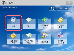 원고대 또는 피더에 원고를 세트하고 → 메인 메뉴 화면에서 [복사]를 누릅니다.