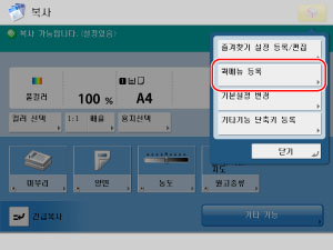 사용자메뉴에 복사, 스캔하여 송신 및 스캔하여 저장 등 자주 사용하는 기능 설정을 등록하면 다른 기기에서도 이러한 설정을 사용할 수 있습니다.