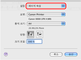 Mac OS X 10.5.x에서 [페이지 설정] 대화상자는 응용 프로그램에 따라 다릅니다.