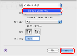 [설정]에서 [기본 설정값으로 저장]을 선택하고 → [확인]을 클릭합니다.
