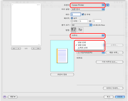 [인쇄 스타일]에 대한 기본 설정은 [양면 인쇄]입니다. 그러나, 일부 드라이버 버전의 경우 [단면 인쇄]가 기본 설정입니다.