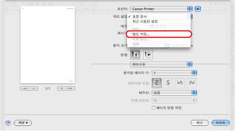 프리셋을 편집하려면 [프린트] 대화상자에서 해당 프리셋을 선택하고 → 프린터 드라이버 설정을 지정한 후 → [미리 설정]에서 [저장]을 선택합니다.