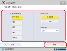 若選擇[影印/列印]、[傳送]或[接收],可以設定顯示的工作類型。