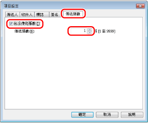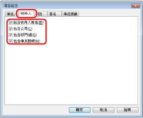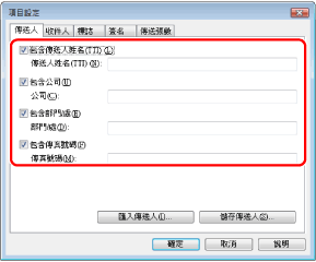 透過按一下[儲存傳送人],可以將輸入到[傳送人]頁中的資訊儲存到檔案中。這樣,傳送傳真時,可以使用[匯入傳送人]匯入資訊,而不需要每次傳送傳真時都輸入傳送人資訊。