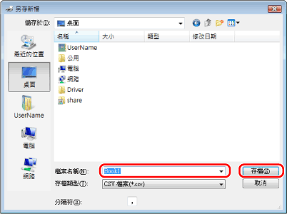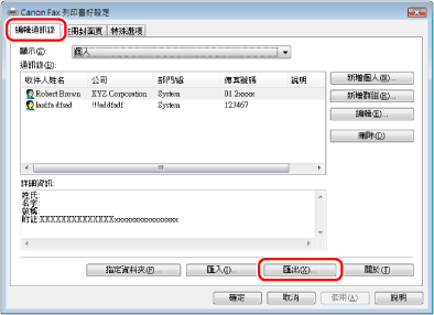 若在[特殊選項]頁的[安全設定]對話方塊中選擇了[匯出地址清單時使用密碼保護],則按一下[匯出]時會顯示用於輸入密碼的對話方塊。有關詳細資訊,請參閱連線說明(請參閱「檢視連線說明」)。