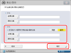 若將<使用與IPv4相同的主機名稱/網域名稱>設定為「關閉」,按[主機名稱]→輸入本機器名稱→按[確定]。按[網域名稱]→輸入本機器所屬的網域的名稱→按[確定]。
