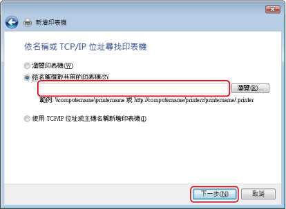 Windows Vista/Server 2008/7:選擇[新增網路、無線或Bluetooth印表機]→[我需要的印表機不在清單中]→[依名稱選取共用的印表機]。