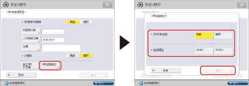 若要限制只有通過「進階郵件信箱的使用者存取控制」認證的使用者才能進行SMB列印,<使用SMB認證>按[開啟]。(有關「進階郵件信箱的使用者存取控制」的詳細資訊,請參閱