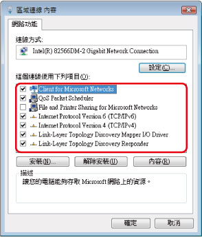 在[區域連線內容]對話方塊中,選擇[Client for Microsoft Networks]和[Internet Protocol(TCP/IP)]/[Internet Protocol Version 4 (TCP/IPv4)]。
