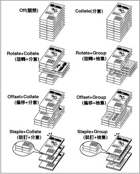 若紙張尺寸為A4、A4R、B5、B5R、LTR或LTRR,可以使用[Rotate+Collate](旋轉+分套)和[Rotate+Group](旋轉+檢集)。