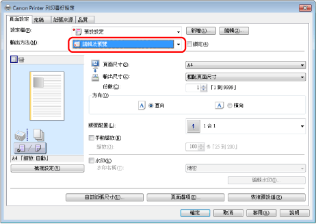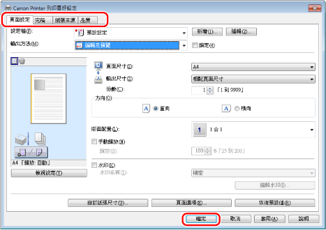按一下[頁面設定]、[完稿]、[紙張來源]和[品質]頁的標籤,然後指定所需的項目。