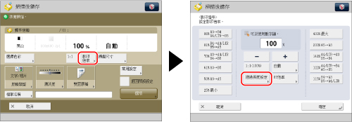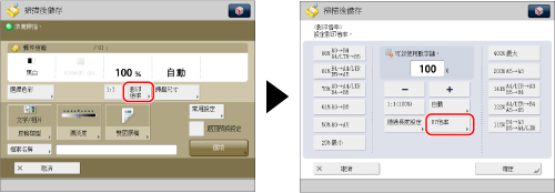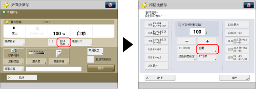 若將原稿放在原稿台玻璃上,假定可以偵測到原稿尺寸,則關閉送稿機後會自動出現縮放倍率。