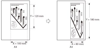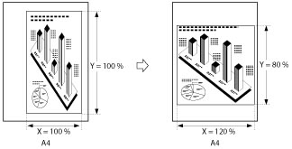 若在「XY倍率」模式下設定縮放倍率,則在列印前可能會旋轉原稿影像。本機器會根據原稿的尺寸和指定的縮放倍率計算是否進行此操作。