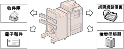 可以輕鬆掃描紙張文件並透過電子郵件或網際網路傳真將其傳送至一個或多個接收者。因此,可以提高文件交換領域的辦公效率。也可以將文件傳送至FTP、SMB和WebDAV檔案伺服器,有助於紙張文件數位化,方便資料存取和管理。