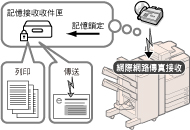 可以設定為使用所需傳送設定自動將符合指定轉傳條件的已接收網際網路傳真文件轉傳至任何接收者。可以將接收的網際網路傳真文件轉傳至其他機器(中繼功能),或將其儲存在「機密傳真收件匣」中。也可以將自動轉傳設定為在指定時間啟用。由於不符合轉傳條件的已接收文件也可以轉傳至任何所需接收者,因此可以用該功能將已接收網際網路傳真文件分類,並傳送給合適的接收者。