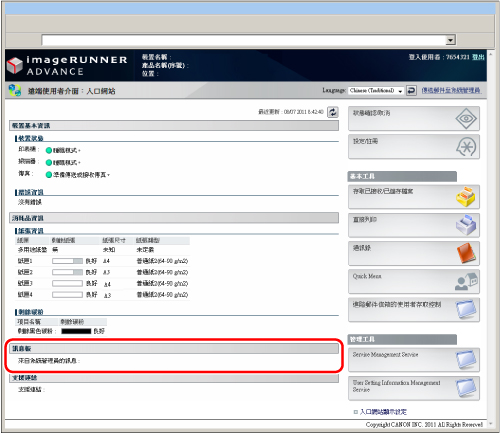 若選擇[在入口網站上顯示],則會在「遠端使用者介面」的入口網站頁面上顯示訊息板。