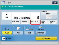 試しコピーは、[ソート(1部ごと)]、[シフト(ずらし)]、[90度回転]、[ホチキス]、[表紙]、[挿入紙]、[製本]、[OHP中差し]で複数部コピーを設定したときに表示されます。