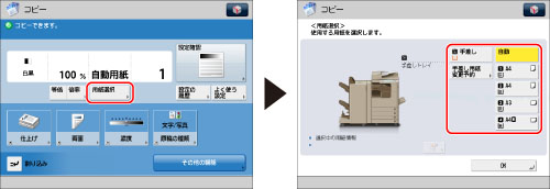 [用紙カセット自動選択のON/OFF]で「OFF」に設定した用紙カセットの用紙には自動用紙選択ではコピーできません。(→機能ごとに給紙箇所を自動で選択する)また「ON」に設定されているカセットでも、用紙種類によっては自動用紙選択されない場合があります。自動用紙選択されない用紙カセットをお使いになる場合は、手動で指定したあとコピーしてください。