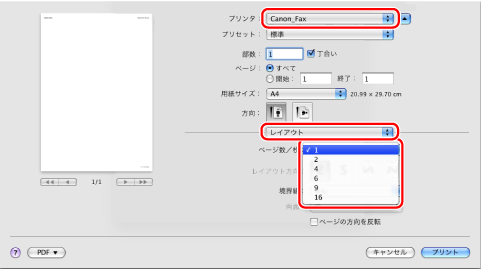 お使いのファクス→[レイアウト]→[ページ数/枚]から用紙1枚に配置するページ数を選択