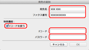 宛先名とファクス番号を入力→[Fコードを使う]にチェックマークを付ける→Fコードとパスワードを入力